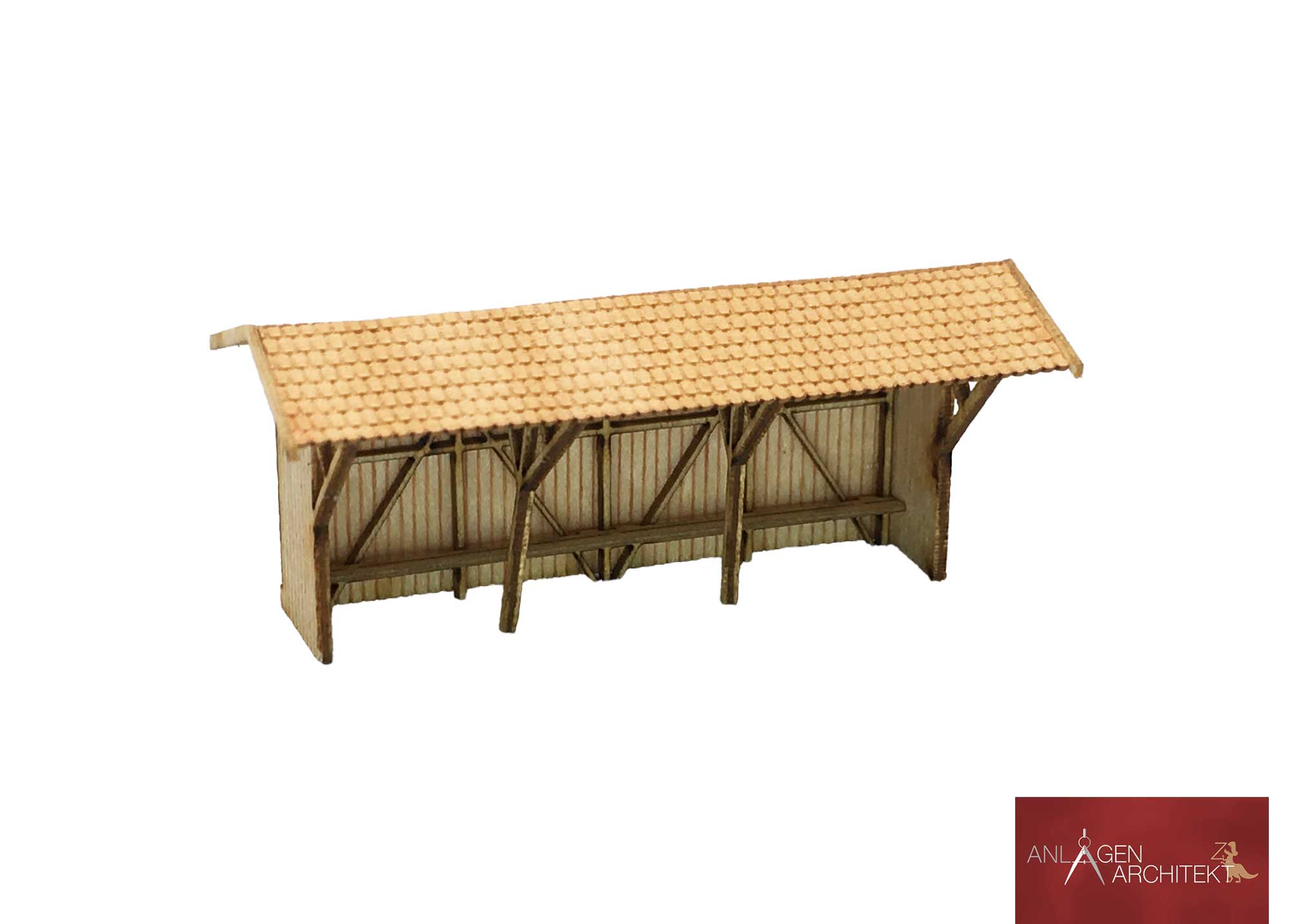 Mit seiner typischen Holzbauweise und dem fein strukturierten Dach fügt sich das Wartehaus perfekt in idyllische Streckenabschnitte ein – vom ländlichen Haltepunkt bis zum kleinen Museumsbahnhof.